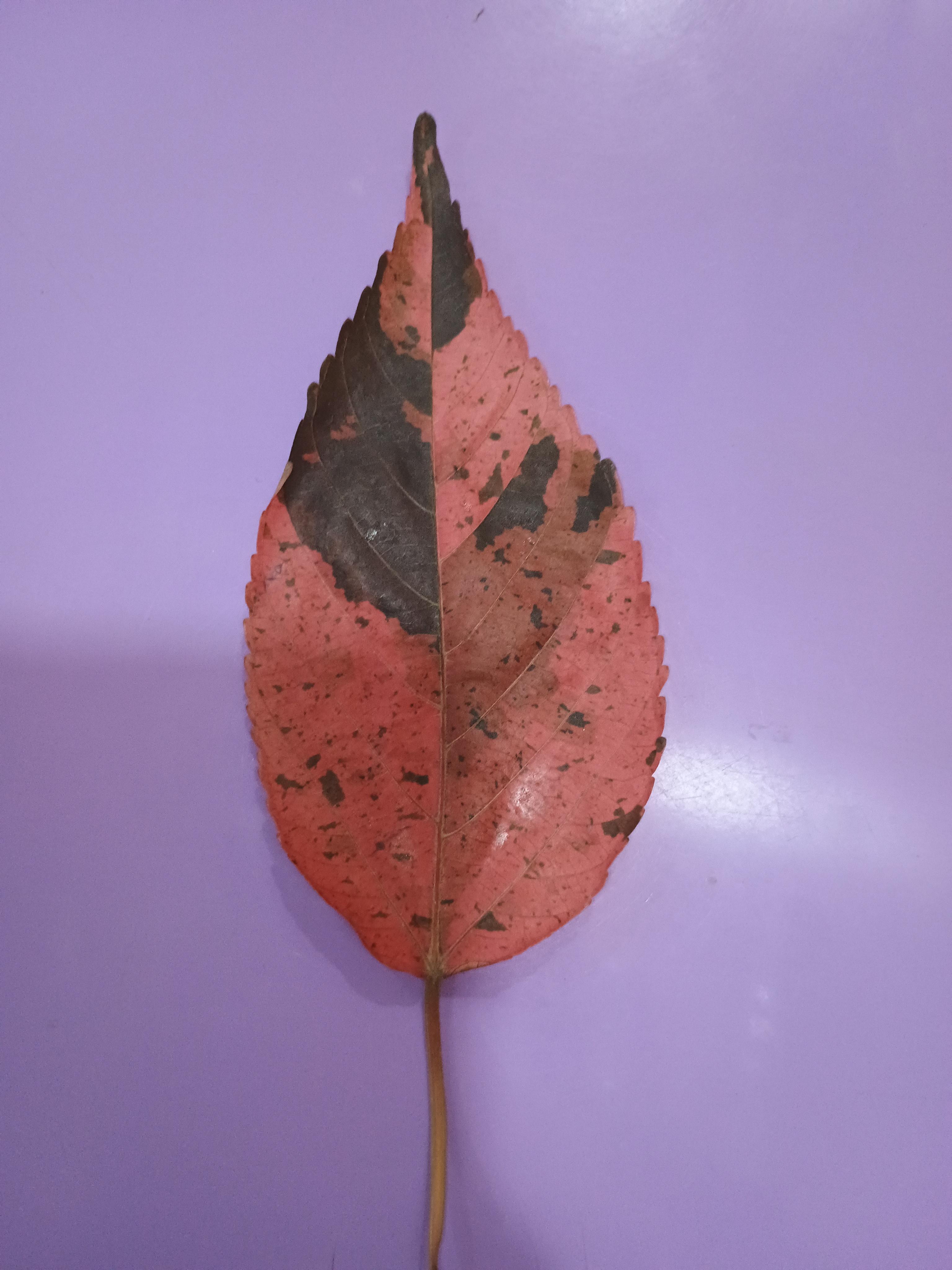 This leaf is bright red with dark brown spots that make it look unique and beautiful. It has a pointed tip and small teeth-like edges, showing its natural shape clearly. The colors and patterns make it look like a piece of autumn art.The red color appears when the green pigment fades away as the season changes. The dark spots show that the leaf is starting to dry, but it still looks full of charm. This leaf reminds us how nature creates beauty in every season.Fun Facts. 1. This red leaf changes color because it loses its green pigment (chlorophyll) as the season cools. 2. The red shade comes from anthocyanins, a natural pigment that also colors apples and cherries. 3. The dark brown patches show that the leaf is starting to dry or age — it’s nature’s way of saying autumn has arrived. 4. Even after falling, the leaf still helps the soil by turning into compost and giving nutrients back to the earth. 5. Every mark and vein on this leaf is unique, just like a fingerprint.