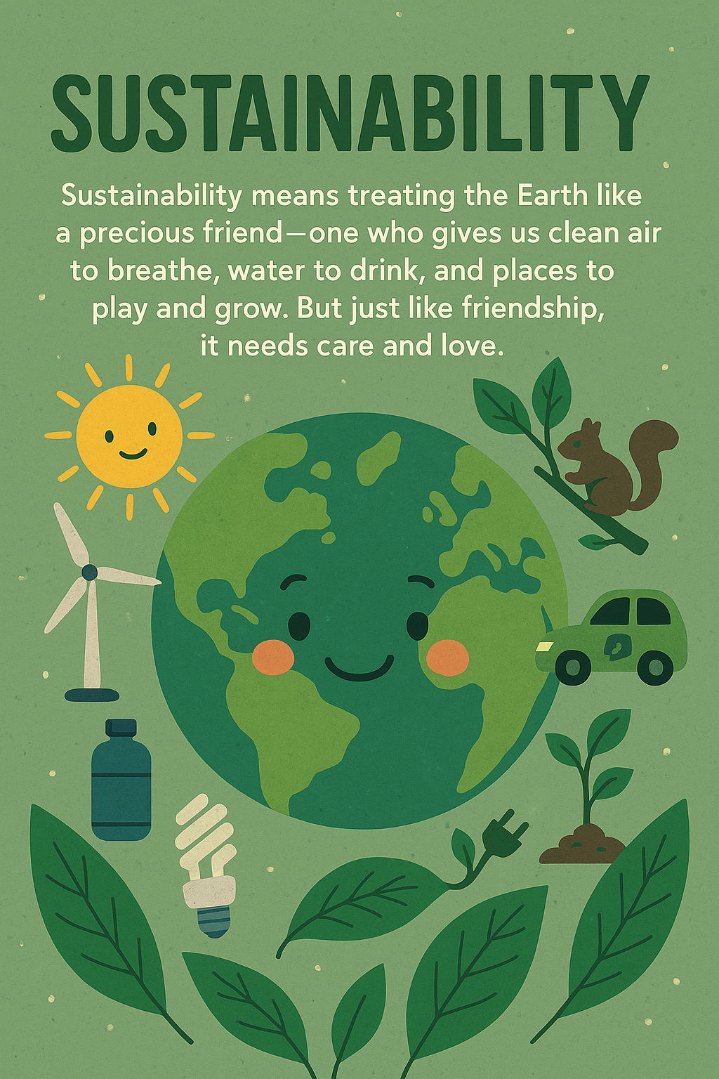 π± Sustainability means taking care of our planet so that it stays healthy for a long, long time. It’s like being kind to the Earth, thinking about how our actions today affect tomorrow.