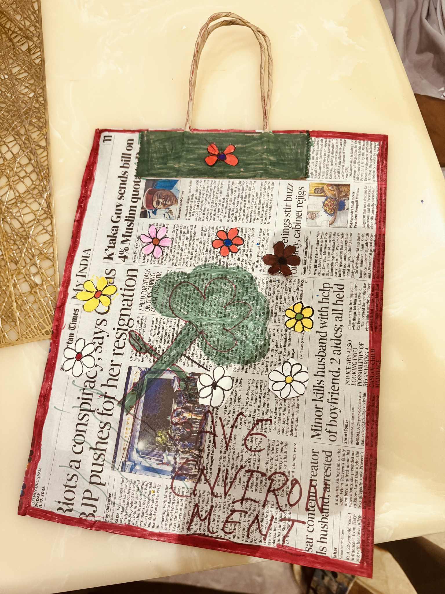 Making of paper bag through old newspaper to use waste paper in use and save environment . By this we can avoid the use of plastic bag which is very dangerous for environment.