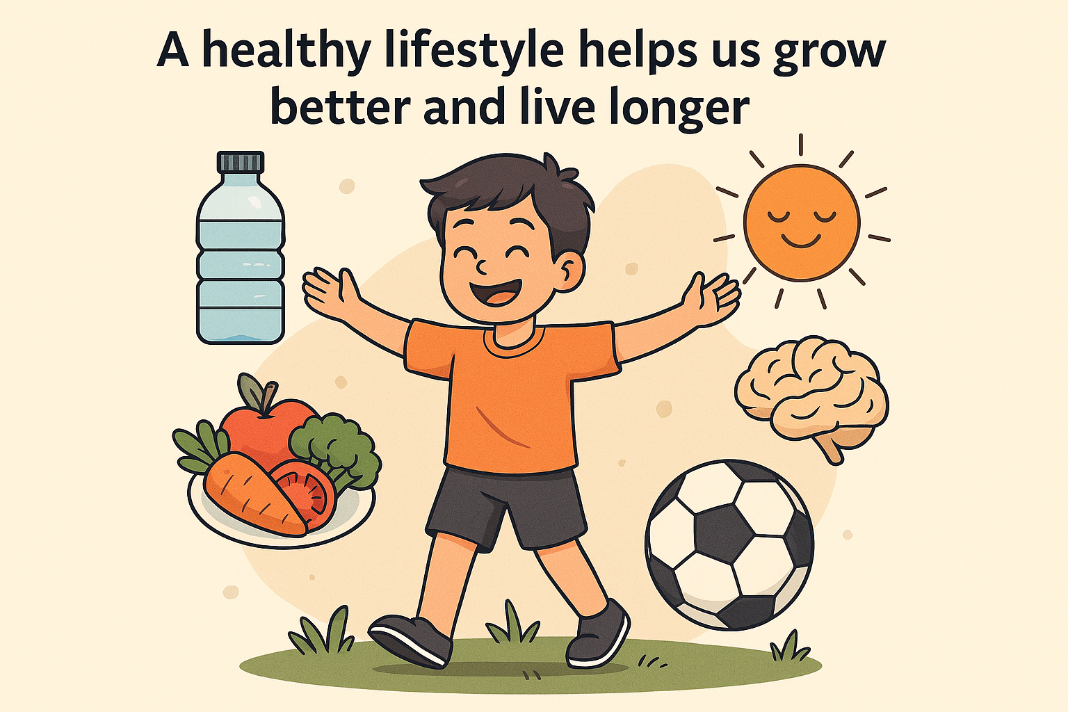 Living a healthy life keeps us strong and happy. When we eat fruits and vegetables, our body gets the vitamins it needs. Playing outside, running, and doing exercises help our muscles grow. Sleeping early and waking up fresh gives us energy for the whole day. Staying away from junk food and bad habits keeps our body safe. A healthy lifestyle helps us do well in school, enjoy time with friends, and feel good every day!